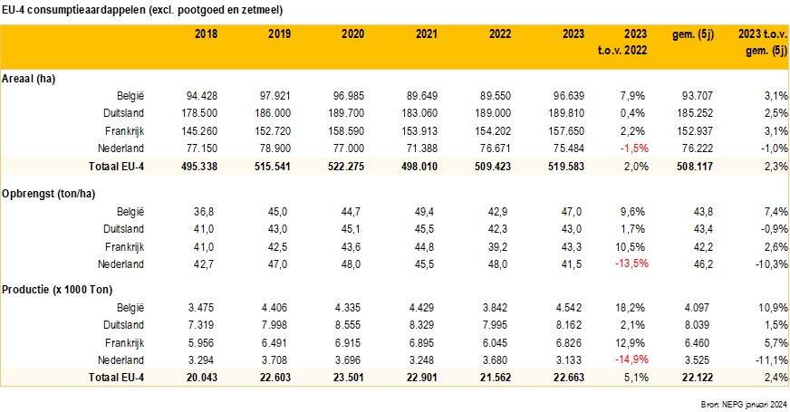 De totale productie van de 4 NEPG-landen (Nederland, Frankrijk, Duitsland en België) bedroeg in totaal 22,7 miljoen ton. Dat is 5,1% meer dan in 2022 en bijna evenveel als het vijfjarig gemiddelde. Deze cijfers houden rekening met de geschatte verliezen in de 4 NEPG-landen. De totale oppervlakte bedroeg 519.583 ha. Dat is 2,0% meer dan in 2022. De gemiddelde opbrengst in de NEPG-regio bedroegen 43,7 t/ha. Dat is 1,4% meer dan in 2022.