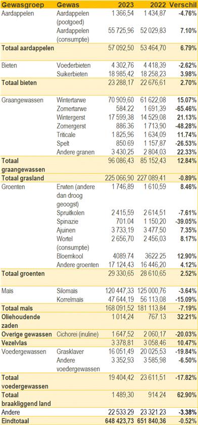 In 2022 lagen de graanprijzen op een hoog niveau, wat zich vertaalt in een grotere interesse bij landbouwers dit jaar om graan te telen. Bovendien waren de zaaiomstandigheden voor wintertarwe en wintergerst vorig najaar goed. Een hoger wintertarweareaal betekent steevast een lager maïsareaal (-7,2%). De toename in areaal braakliggend land (+62,9%) is vermoedelijk toe te schrijven aan de nieuwe verplichtingen in het GLB rond niet-productief areaal binnen de conditionaliteit.