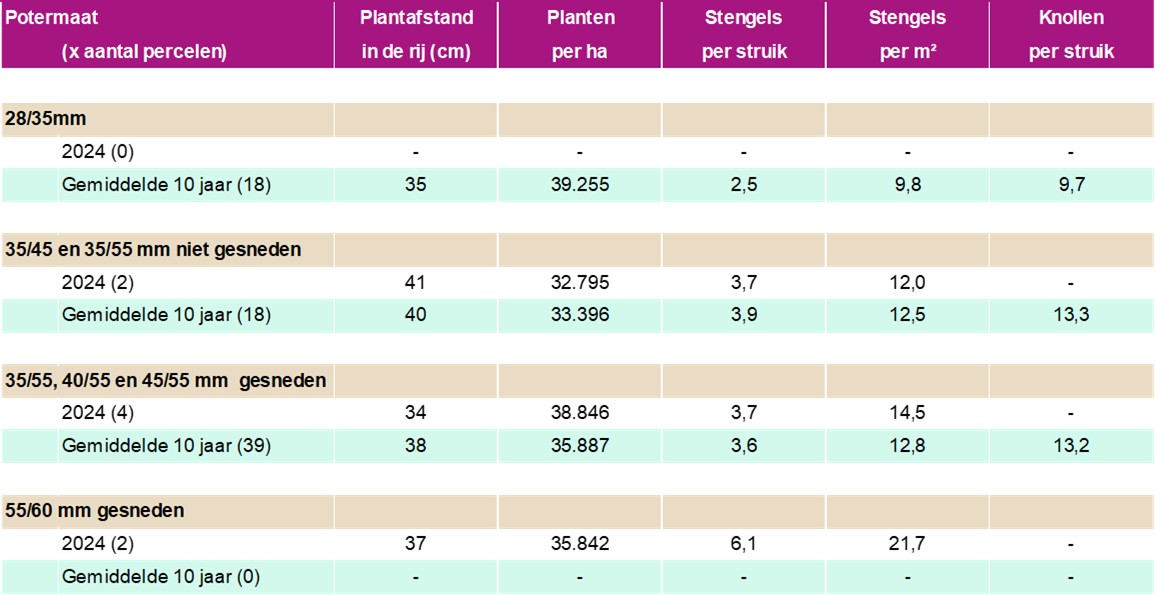 Op vijf percelen werd de potermaat 35/55mm geplant. Eén perceel werd op 31 cm in de rij geplant en de andere vier op 42 à 45 cm. Aan deze planten werden gemiddeld 3,5 stengels geteld. Dit komt neer op 11,6 stengels per m² met een variatie tussen de percelen van 9,3 tot 14,4.
