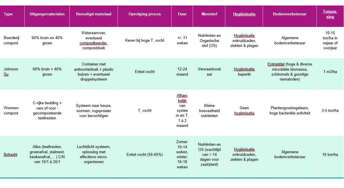 De eindproducten van de verschillende verwerkingsprocessen kunnen een positieve invloed hebben op de bodemvruchtbaarheid (onder andere bodemstructuur, organische stofgehalte, bodemmicrobiologie), maar hebben elk hun eigenheid en karakteristieken.