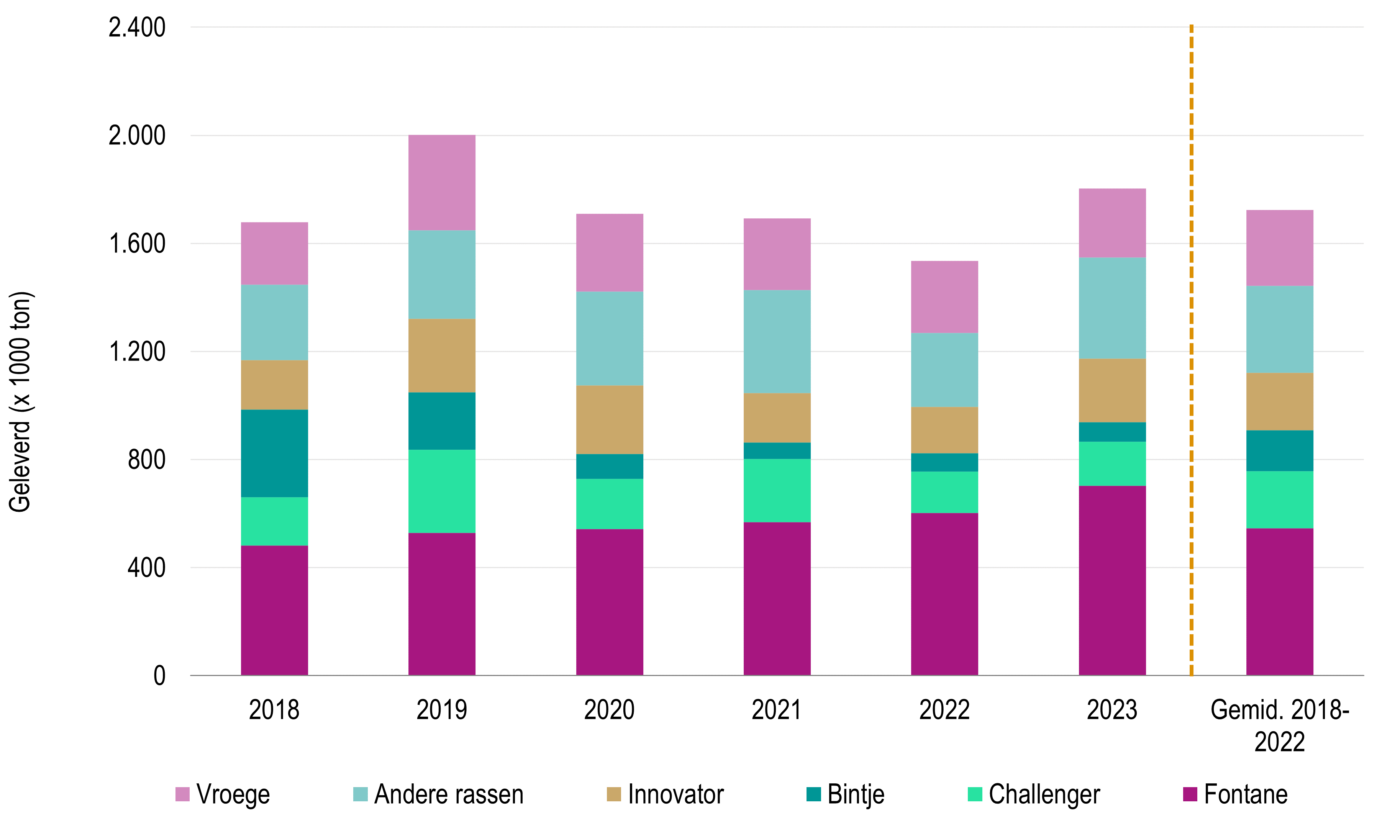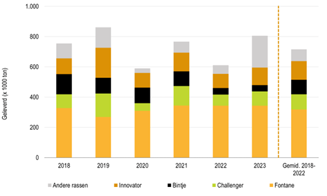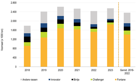 Bintje, Challenger en Innovator vertegenwoordigen maar een klein aandeel in de totale voorraad op 1 februari (elk 5% en minder). Fontane neemt 2/3den in en de overige 20% wordt ingenomen door de grote groep aan andere rassen (Markies, Agria, SH C 909).