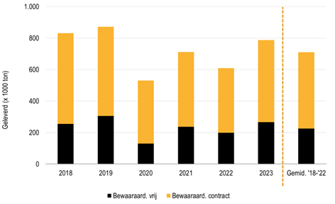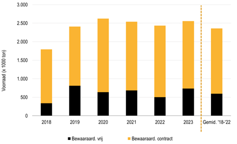 Van de huidige voorraad is 29% vrij en ligt net boven het vijfjarig gemiddelde (25%). Dit percentage is een gevolg van de relatief hoge opbrengsten dit jaar, waardoor er meer vrije aardappelen overblijven. Uitgedrukt in tonnen betekent dit dat er momenteel 1,82 miljoen ton aardappelen onder contract ligt. Dit is vergelijkbaar met de voorbije 3 jaar. De hoeveelheid vrije aardappelen daarentegen is dan weer de op één na hoogste van de afgelopen jaren (0,74 miljoen ton). Deze zijn dan ook nodig om de alsmaar stijgende vraag naar grondstoffen op te vangen.