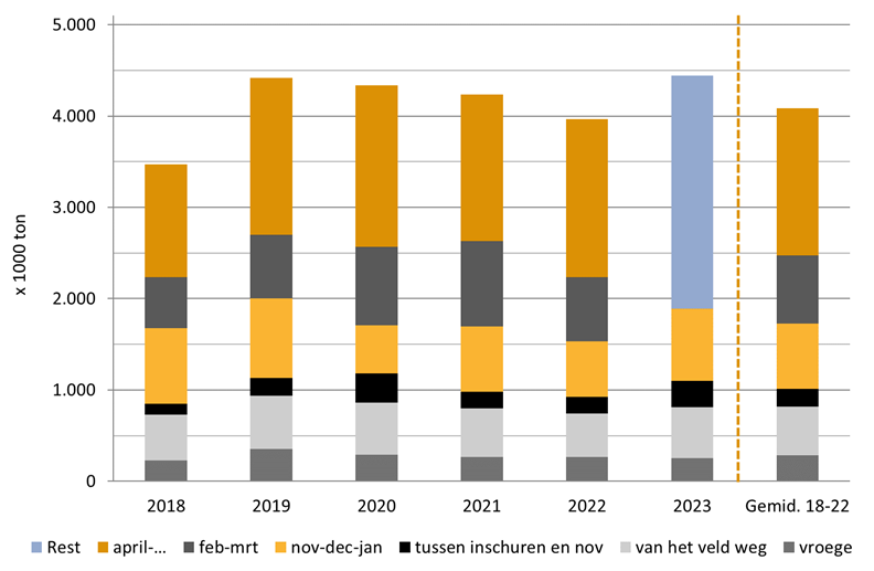 Tussen half november en 1 februari werd zo’n 780.000 ton bewaaraardappelen afgeleverd. Ook dit is zo’n 11% hoger dan de afgelopen vijf jaar. De toename is zowel te zien bij de afzet van de vrije aardappelen als bij de contracten.