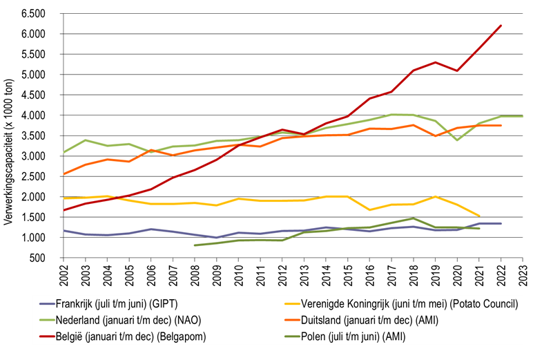 In onderstaande grafiek is te zien hoe de verwerkingscapaciteit van België en de omringende landen in de afgelopen jaren is geëvolueerd. Als we de EU4 (B, Ndl, Fr, Du) samentellen dan is de totale hoeveelheid benodigde aardappelen tussen 2013 en 2022 toegenomen van 11,7 miljoen ton naar 15,3 miljoen ton. Dit is een stijging van 30%. Ook in 2023 deden verschillende verwerkers nog verdere investeringen en uitbreidingen.