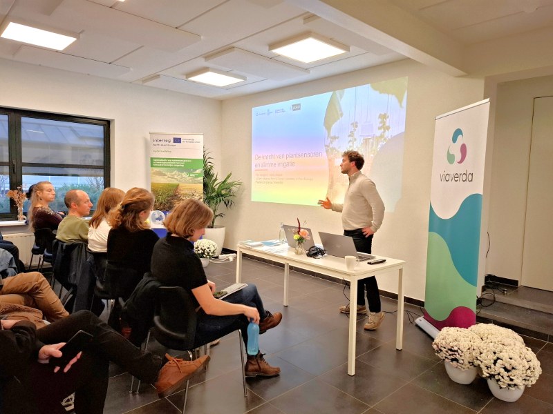 Daarna presenteerden Flor Hiergens (UGent) en Paulien De Clercq (Viaverda) het gebruik van plantsensoren als hulpmiddel om watertekorten sneller te detecteren. Ze deelden hun praktische bevindingen uit de proefopstellingen en wezen op de meerwaarde van realtime gegevens voor teeltsturing.