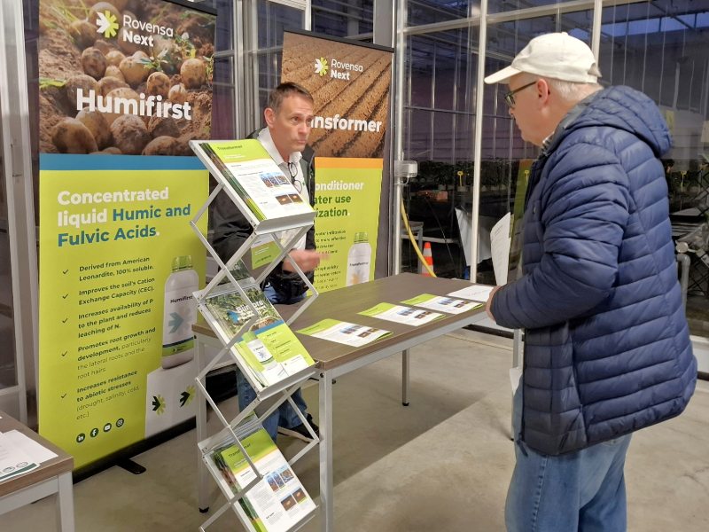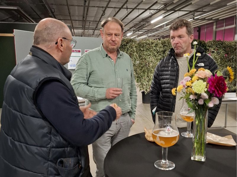 Bedrijven stelden hun producten en diensten op een technologiebeurs voor. De technologiebeurs werd extra opgefleurd met een natje en een droogje. Viaverda-directeur Bruno Gobin in gesprek met telers op het netwerkmoment.