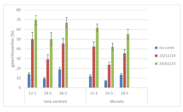 Figuur 1: Gewichtsverlies voor beide rassen voor verschillende condities na curen en tijdens bewaring (Bron: VCBT 2025)