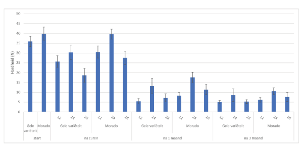 Beide rassen hebben bij start een gelijkaardige hardheid, na curen neemt deze hardheid af. Het curen bij 24°C zorgt in vergelijking met de andere bewaarcondities, voor een beter behoud van hardheid. Dit positief effect is enkel significant voor de 1 maand bewaring, in verder bewaring gaat de significantie verloren. De hardheid van de knollen neemt met meer dan 50% af, al na 1 maand bewaren.
