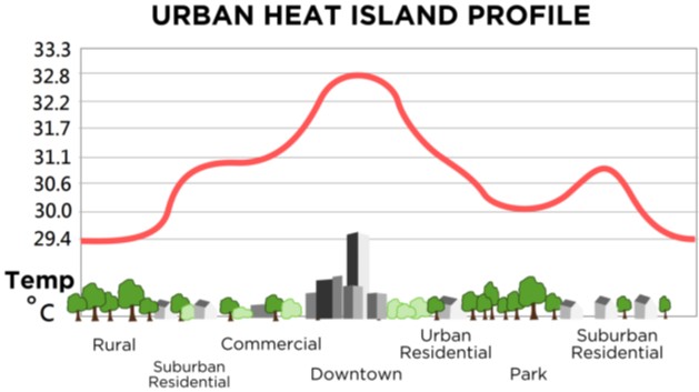 Figuur 2: Temperatuur naargelang de locatie (Urban Heat Island) – Bron: Royal Meteorological Society.