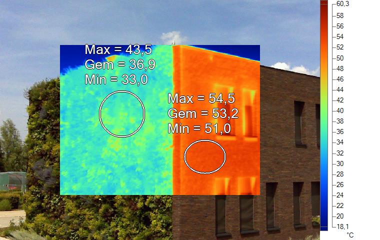 Het Urban Heat Island (UHI) effect is het fenomeen waarbij het stedelijk gebied aanzienlijk warmer is dan de omliggende plattelandsgebieden. Voornamelijk door menselijke activiteiten, de aanwezigheid van beton en asfalt, het gebrek aan vegetatie en de beperkte luchtcirculatie door de vele gebouwen, kan dit verschil oplopen tot wel 10°C. Een stijging van de omgevingstemperatuur met 1°C zorgt voor 2 tot 4% meer elektriciteitsverbruik. Dit effect, en bijgevolg ook het elektriciteitsverbruik, kan verkleind worden door meer groen te implementeren. Steden hebben echter maar een beperkte ruimte ter beschikking. Gevelgroen biedt hier de ideale oplossing.