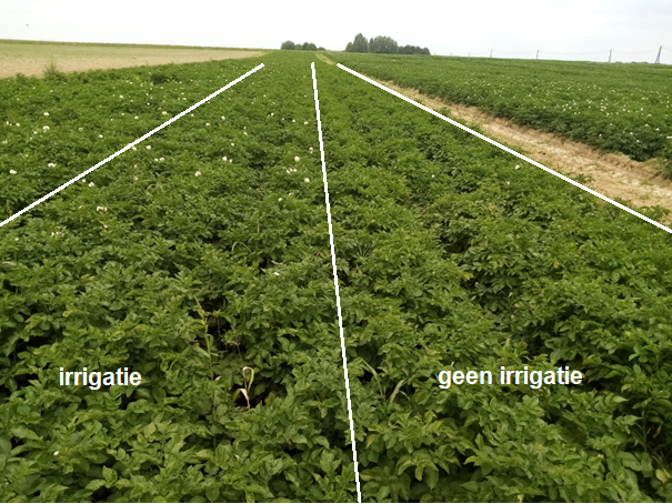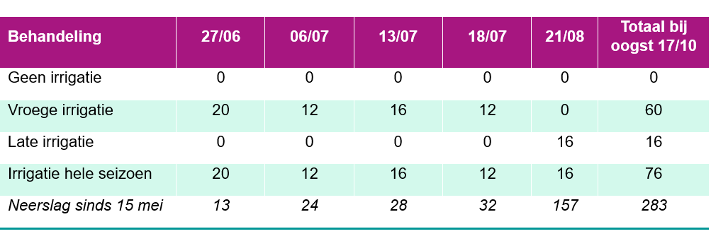 Er werd eind juni en begin juli vier keer beregend in de vroege groeifase en eenmaal eind augustus in de late groeifase (Tabel 1), maar door regenval kort nadien was het effect van deze late irrigatie verwaarloosbaar en werd er beslist om enkel de twee behandelingen 'geen irrigatie' en 'irrigatie hele teeltseizoen' te beoordelen.