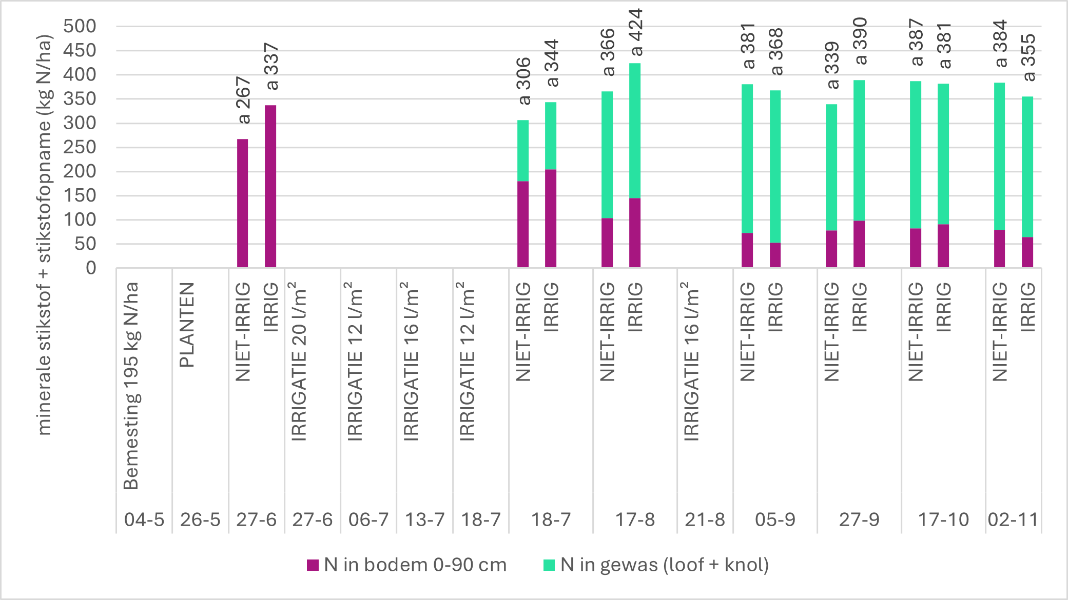 De stikstof in het gewas werd eveneens bepaald om de som te kunnen maken van de bodemvoorraad en de opname en zo na te gaan of irrigatie zorgde voor een grotere stikstofmineralisatie. Er was echter geen consequent grotere toename in het geïrrigeerde object na het uitvoeren van de irrigatie (Figuur 4). Dit doet ons besluiten dat het bodemvochtgehalte niet beperkend was voor de stikstofvrijstelling, maar wel voor de wateropname door het gewas.