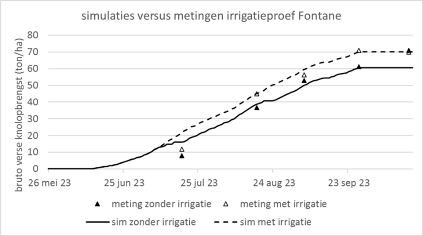 De groei van beide behandelingen uit de irrigatieproef werd ook gesimuleerd met een groeimodel voor aardappelen. Dit model werd door Viaverda in kader van het project gekalibreerd en gevalideerd op basis van de eigen historische datasets. De simulaties waren behoorlijk goed, maar de gesimuleerde groei werd in het niet-geïrrigeerde object te vroeg beëindigd. Hier moet verdere kalibratie beterschap te brengen. Eenmaal dit op punt staat kunnen we het model gebruiken om opbrengst en oogstdatum te voorspellen voor verschillende weerscenario’s en in te schatten of irrigatie al dan niet interessant is, afhankelijk van de droogtegevoeligheid van het perceel.