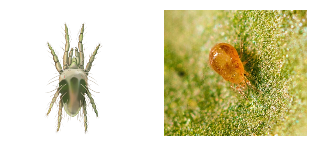 Ontwikkeling kasspintmijt Tetranychus urticae (links) en de roofmijt Neoseiulus californicus (rechts). (Bron: Koppert)