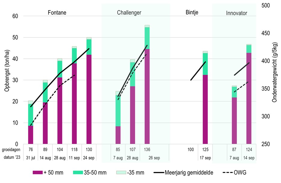 Innovator haalde eveneens een mooie bruto-opbrengst van maar liefst 47 ton/ha. De hoeveelheid uitval valt mee met een gemiddelde van 2,5 ton/ha. Bijna alle knollen (92%) behoorde tot de +50mm.