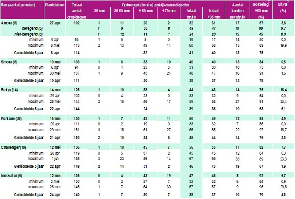 Enkel de vroege rassen haalden lagere opbrengsten. Hun groeiseizoen was te kort om de latere plantdatum en de moeilijk groeiomstandigheden in juni goed te maken. Uitsluitend de beregende percelen haalden (zeer) mooie opbrengsten. Halfvroege rassen als Sinora konden wel nog veel inhalen onder andere door de oogst uit te stellen tot latere datum. Hierdoor werden voor dergelijke rassen wel nog ‘normale’ opbrengsten behaald. De late rassen zoals Bintje, Innovator, Fontane en Challenger haalden uiteindelijk hogere opbrengsten waarbij de bruto-opbrengst zo’n 7 ton/ha hoger uitkwam dan het vijfjarig gemiddelde. Vooral Challenger en Innovator deden het zeer goed dit seizoen.