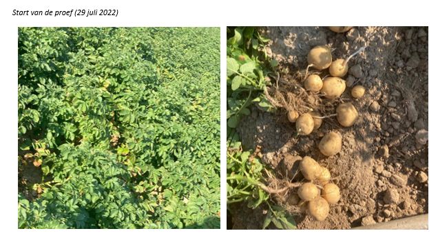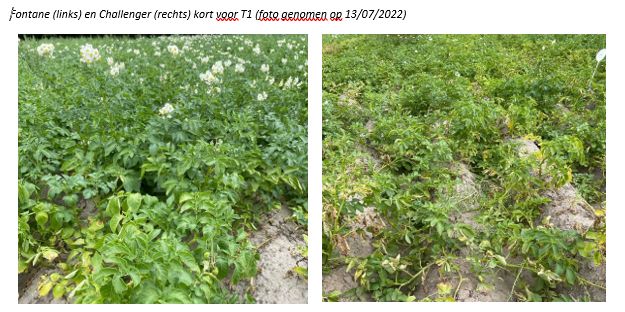 Het proefveld in Sint-Niklaas was aangelegd in een zandgrond. De warmte en droogte veroorzaakte daar extra stress aan het gewas. Half juli was duidelijk dat zowel Fontane, maar zeker Challenger snel achteruitgingen omwille van de moeilijke groeiomstandigheden. Daarom dat een eerste behandeling reeds plaats vond op 14 juli. Door een vlotte groei in het voorjaar was de noodzakelijke grofte wel bereikt. Al snel was duidelijk dat de MH-bespuiting voor extra stress had gezorgd: het gewas ging extra snel achteruit. Een tweede bespuiting begin augustus kwam dan ook te laat om nog te resulteren in een maximale opname van de maleïnehydrazide. Tegen half augustus was het loof van het volledige perceel helemaal afgestorven, ook zonder MH-behandeling. Uit de opbrengstcijfers is te zien dat het gewas enorm geleden had in de zomer van 2022. Zelfs zonder een MH-behandeling werd nog geen 20 ton/ha gehaald (praktijkopbrengst). Een MH-behandeling zorgde voor 1 à 2 ton/ha extra verlies.