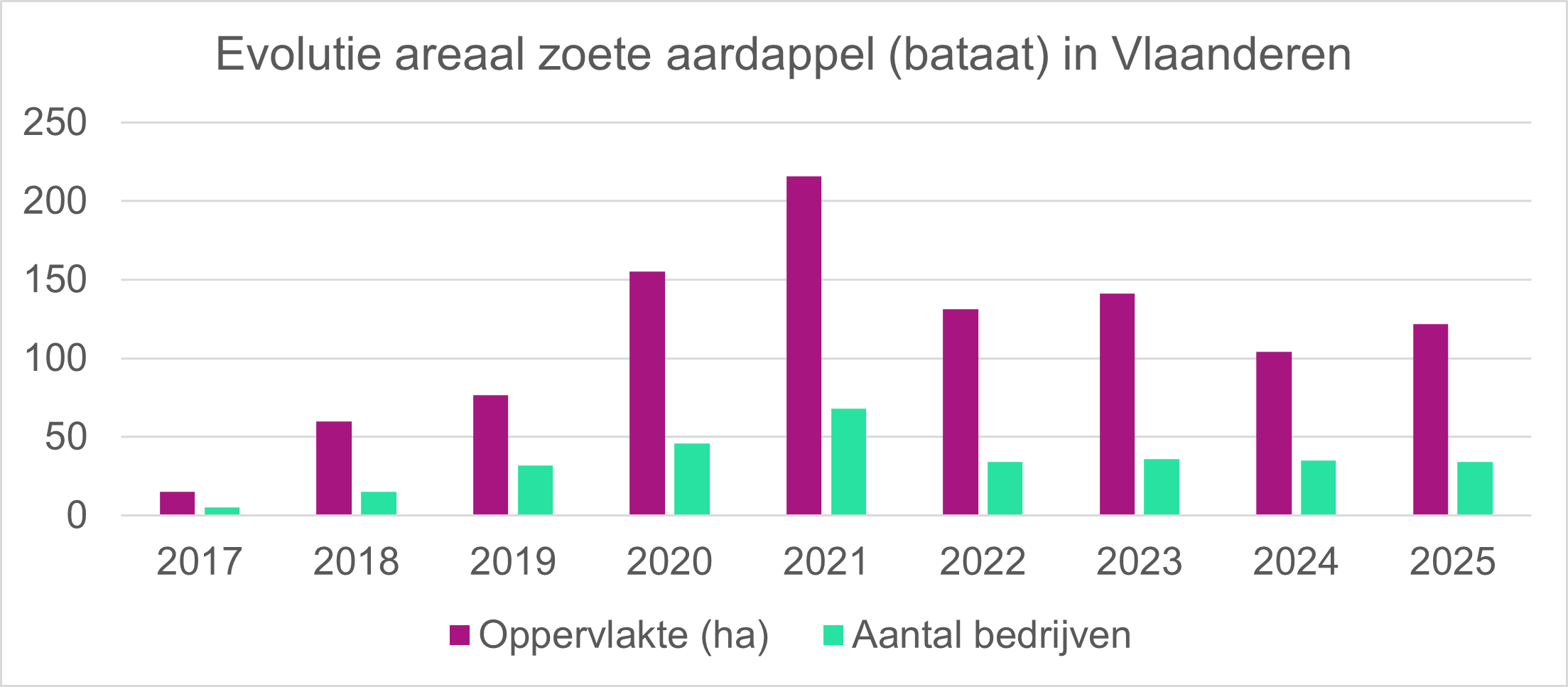 Vlaanderen publiceerde begin juli de resultaten van de perceelsaangifte 2025. Voor bataat zien we dat het areaal en het aantal producerende bedrijven sinds 2022 gestabiliseerd is. De voorbije 4 jaar zien we eenzelfde aantal producerende bedrijven en slechts beperkte schommelingen in het areaal. Na een daling in 2024 zien we dit jaar terug een lichte stijging van het areaal.