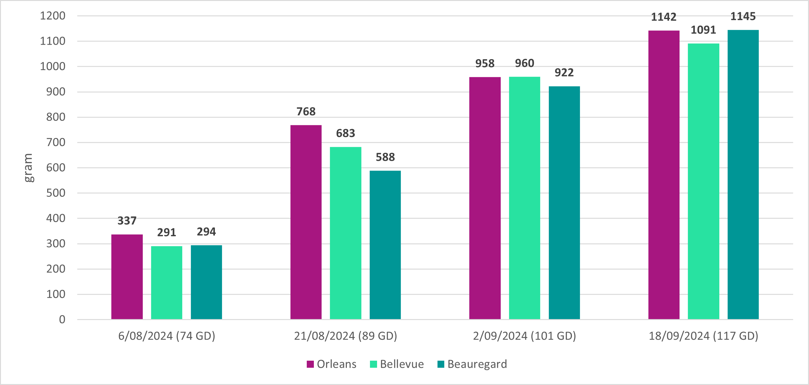 Het resultaat kan je volgen in onderstaande grafieken. De gemiddelde opbrengst per plant die wordt weergegeven is het gemiddelde bij oogst van ruim 12 m² bataat per ras en per plantdatum. Bij de aanplant van 24 mei zitten de gemiddelde opbrengsten voor Orleans, Bellevue en Beauregard respectievelijk op 1142, 1091 en 1145 gram per plant.