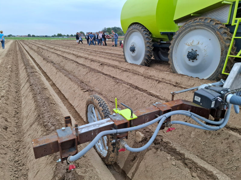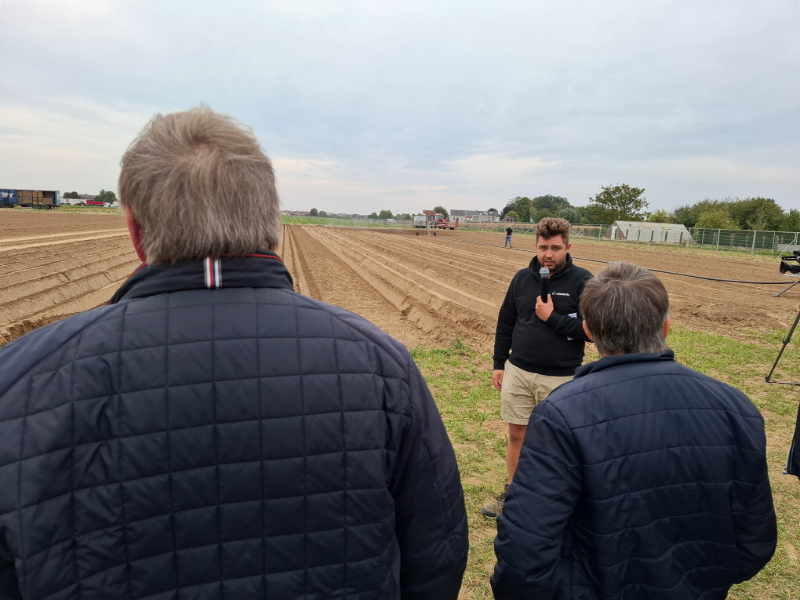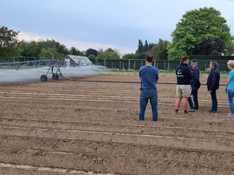 Op het groenteplatform hadden ook demonstraties rond opkomstirrigatie plaats, onder meer met een klassieke beregeningsboom. Jonas Bodyn legt verschillende proeven in opkomstirrigatie uit. Dat is voor verschillende teelten belangrijk om een goede start te nemen. De firma Smedecon lichtte hun specifieke techniek toe: bandirrigatie op ruggenteelten.