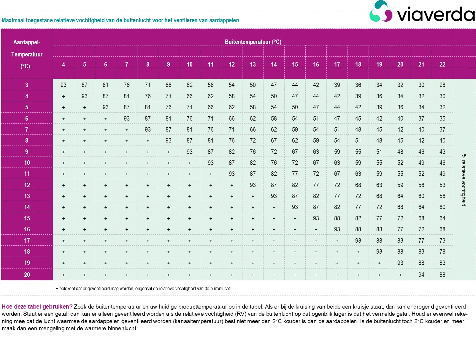 Buitenlucht die kouder is dan de aardappelen is drogend en vormt dus geen probleem voor zoverre de aardappeltemperatuur hierdoor niet te hard daalt (niet onder 12°C). Is dit het geval, maak dan gebruik van een warme luchtkanon om de ruimte en de aardappelen een beetje op te warmen. Stel de thermostaat in op 2 graden hoger dan de aardappeltemperatuur.