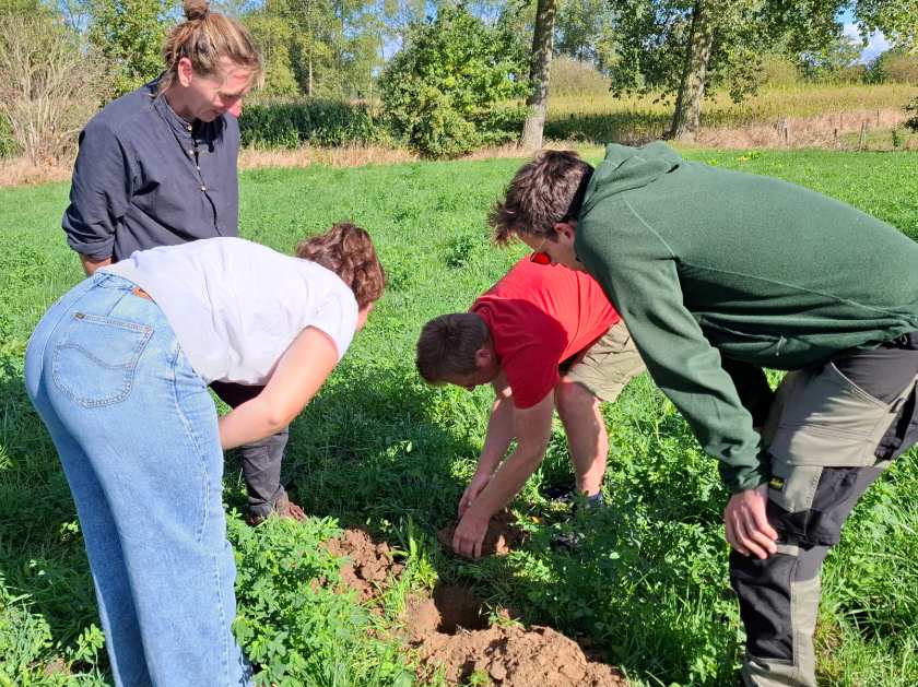 Op de bijeenkomst gingen we met de spade in de grond. Kris werkt al jaren aan een harde laag in de bodem met mengsels van groenbedekkers of grasklavermengsels met diepwortelende soorten, zoals luzerne. Hij maakte de keuze voor groenbedekkermengsels omdat hij ondervond dat op het ene perceel één soort het goed deed, maar een andere niet. Op een ander perceel was het omgekeerde waar. Mogelijks kwam dit door de zuurtegraad van de bodem. Door mengsels te gebruiken zijn er altijd soorten die goed gedijen op die specifieke ondergrond en hij paste zijn mengselkeuze hier ook op aan. Nu konden we een waardevolle, kruimelige grond zien, maar de harde laag was nog niet helemaal verdwenen.
