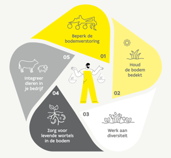 - Werk aan diversiteit: Door je teeltplanning diverser te maken, creëer je een diverse en gezonde bodembiologie. Die verbetert de nutriëntenkringloop, reduceert ziektes en plagen en laat neerslag makkelijker in de grond dringen