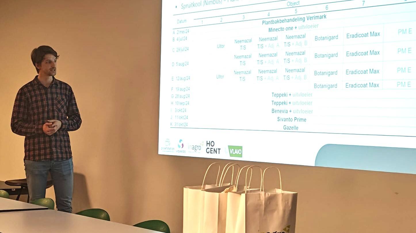 De namiddag werd afgesloten met de eerste resultaten van het project BREVAL. Na een algemene inleiding over de problematiek werden enkele veldresultaten toegelicht, waaronder de spruitkoolproef die door Viaverda werd uitgevoerd. "Met dit project willen we aan een geïntegreerd systeem werken waarbij er maximaal gebruik wordt gemaakt van natuurlijke plaagbestrijding van bladluizen en koolwittevliegen, gecombineerd met (biologische) producten", zegt Louis Lippens, onderzoeker Viaverda. Door meer kennis over de biologie in het veld gecombineerd met productkennis (zoals selectiviteit naar nuttigen en werkzaamheid) willen we verder uitwerken in de komende jaren.