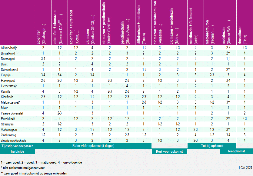 Bij aanwezigheid van melganzenvoet zijn de actieve stof aclonifen (Challenge, Novitron DAMtec, Gofor) of pendimethalin (Stomp Aqua, Stallion) aangewezen. Bij perzikkruid hebben Gofor, Stallion en Stomp Aqua een goede werking, maar ook Amazone, Artist, Centium, Challenge, Metric en Novitron DAMtec scoren vrij goed op dit onkruid. In na-opkomst én op jong perzikkruid scoort ook Sencor goed. Voor zwarte nachtschade zijn we vooral aangewezen op Amazone, Centium, Novitron of Stomp Aqua. In naopkomst valt dit onkruid niet meer te bestrijden. Voor zwaluwtong zijn vooral Amazone en Novitron DAMtec aangewezen of combinaties met Proman of Challenge. Varkensgras wordt best bestreden met de actieve stof clomazone (Centium, Amazone, Metric, Novitron DAMtec en Stallion) ofwel met Proman of Stomp Aqua. Voor hanenpoot zijn vooral Amazone, Gofor, Proman, Artist, en Tavas op hun plaats, of Titus in na-opkomst. Tegen doornappel blijken Artist en Sencor een behoorlijke werking te hebben, maar ook Centium, Gofor, Proman, Novitron DamTec, Stomp Aqua, Stallion en Amazone bieden mogelijkheden. Sinds 2022 is de bestrijding van doornappel ook opgenomen in de IPM-checklist als een minor, om tegen 2026 over te gaan in een major (verplichting).