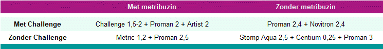 Bij het samenstellen van het schema dienen de middelen gekozen te worden in functie van de te verwachten onkruiden (zie gevoeligheidstabel). Daarnaast speelt in de praktijk ook vaak de afweging om al of niet aclonifen in te zetten (risico op indirecte driftschade) en ook of het ras al of niet gevoelig is voor metribuzin. Hieronder enkele mogelijke schema’s.