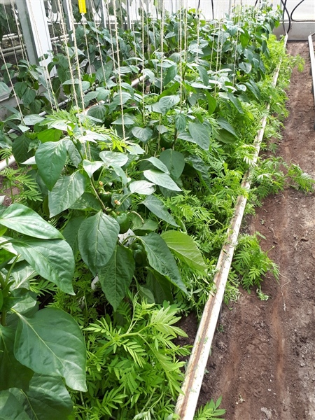 De mogelijkheid om de aantasting door de aaltjespopulatie onder controle te houden met behulp van tussenteelten werd onderzocht bij een hoofdteelt paprika. Bladrammenas, Tagetes patula, Ageratum houstonianum, Cineraria maritima en rolklaver werden onder de paprika’s gezaaid in de dubbele plantrij en stengelui, basilicum en aubergine MAO werden onder/tussen de paprika’s geplant. Tussenteelten die tussen de hoofdteelt vruchtgroenten gezaaid of geplant worden, kunnen de wortelknobbelaaltjes sterker aantrekken dan de hoofdteelt, waardoor deze laatste beter beschermd wordt. Ze kunnen ook fungeren als vanggewas en zo de aaltjes “vangen” in hun wortels. Nadeel van deze tussengewassen was dat sommigen zoals aubergine, Tagetes, bladrammenas en Ageratum een hogere groeisnelheid hadden dan de paprika’s, waardoor deze regelmatig moesten worden teruggesnoeid. Ook bleken de tussenteelten een vochtig microklimaat te creëren waardoor Sclerotinia ontwikkelde in de paprika’s. Het is dus belangrijk om te kiezen voor een tussenteelt die luchtigheid aan de stengelvoet blijft garanderen zodat de gewasgezondheid van de hoofdteelt gewaarborgd blijft.
