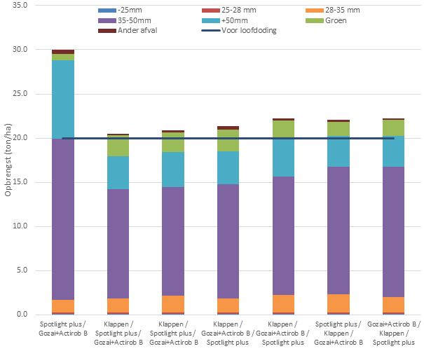 Figuur 2 – Opbrengstresultaten voor loofdoding (horizontale blauwe lijn) en sortering na loofdoding (gestapelde kolommen)
