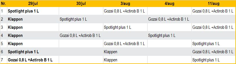 De verschillende loofdodingsstrategieën werden getest op het aardappelras Markies dat bekend staat om zijn stevig, snel ontwikkelend loof dat laat en moeilijk afsterft. De afstand tussen de planten werd, net zoals in de praktijk, zeer nauw aangehouden. De eerste behandeling werd uitgevoerd op 29 juli. Omdat Gozai en Spotlight fotosyntheseremmers zijn (voldoende zonlicht nodig), werden de bespuitingen steeds uitgevoerd in de ochtend of vroege middag.