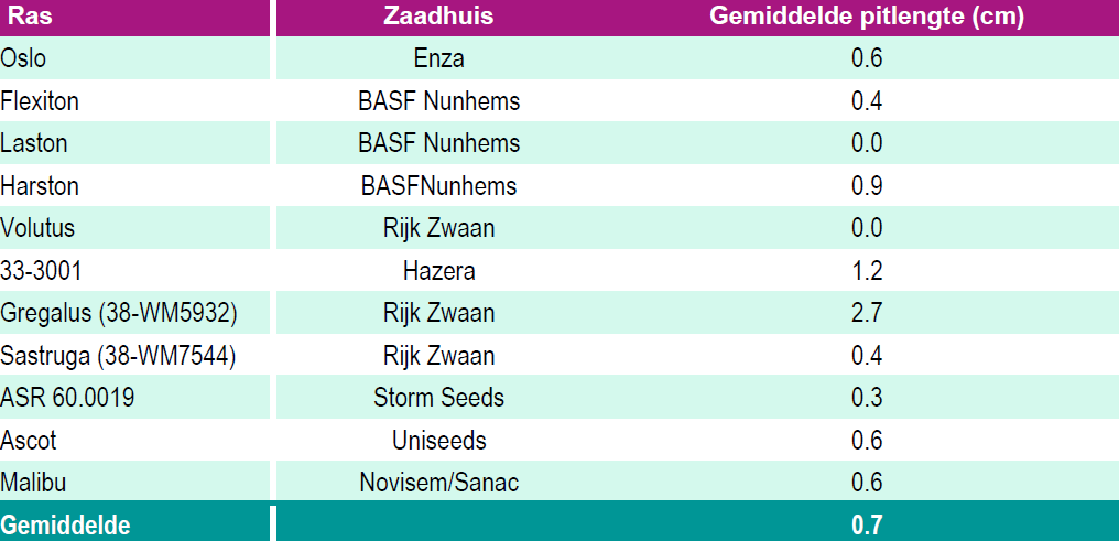 De gemiddelde pitlengte van alle variëteiten was op 20 maart 0.7 cm. Bij het merendeel van de rassen bleef de pitlengte nog heel beperkt. Enkel bij het ras Gregalus (Rijk Zwaan) werd al een pitlengte van 2.7 cm gemeten. Het huidige zachte weer zou zeker voor een toename van de pitlengte kunnen zorgen. Eind deze week wordt een nieuwe meting uitgevoerd om de doorgroei verder op te volgen.