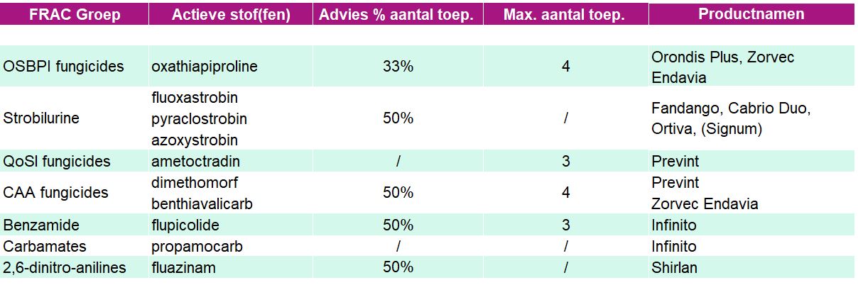 De incubatietijd van valse meeldauw bedraagt 14 tot 21 dagen. Dit is langer dan bijvoorbeeld die van Phytophtora infestans, wat maakt dat Peronospora destructor minder gevoelig is voor resistentie. Minder gevoelig betekent echter niet ongevoelig! Aan de hand van FRAC-richtlijnen kunnen we doordacht met de actieve stoffen omgaan. Zoals het woord het zegt, zijn dit richtlijnen (adviezen) en geen verplichtingen. Het huidige aanbod aan middelen bevindt zich in verschillende groepen (zie tabel).