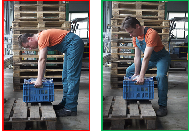 | Figuur 6: Rechts de correcte manier van tillen door door de benen te buigen, links foute manier erg belastend voor de rug |