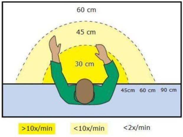De maximale reikafstand, waarbij het lichaam niet overbelast wordt, is afhankelijk van hoe frequent gereikt moet worden (zie figuur 4). Ga je meer dan 10 keer per minuut reiken, bijvoorbeeld tijdens oogsten van sla, dan mag je niet verder dan 30 cm moeten reiken. Als vuistregel kan je onthouden dat dit ongeveer de lengte is van de elleboog tot de vingertoppen. Wordt er minder dan 10 keer per minuut gereikt, dan mag het voorwerp zich al 45 cm van je lichaam bevinden. De maximale reikafstand bedraagt in elk geval 60 cm, deze afstand mag je overbruggen vanaf er minder dan 2 keer per minuut zo ver gereikt moet worden. De maximale reikafstand wordt in de tuinbouw vaak overschreden. Bij het oogsten van sla wordt al snel 3 kroppen ver gesneden, met een plantafstand van 30cm, is dit eigenlijk te ver.