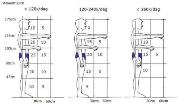 Het laatste tilprincipe gaat over het tillen op een correcte locatie. Het is namelijk niet om het even waar je een al dan niet gevulde bak plaatst, dit wordt schematisch weergegeven in figuur 5. De vuistregel is dat te allen tijde vermeden moet worden om lasten tot boven het hoofd te tillen. Hierdoor gaat de rug overstrekken, wat opnieuw het kraakbeen tussen de wervels kan beschadigen. Bij het vullen van paletten wordt deze regel vaak overschreden, een schaarlift waarbij de palet in de grond kan zinken is ideaal, maar ook een veilig opstapje kan hier een oplossing bieden. Zoals te zien in figuur 5 is het gewicht van de last afhankelijk van de zone waar getild wordt, maar ook van de frequentie waarmee het tillen uitgevoerd wordt. Hoe verder van het lichaam een voorwerp getild dient te worden, hoe lager het gewicht van het voorwerp mag zijn. Per keer mag maximum 25 kg getild worden.