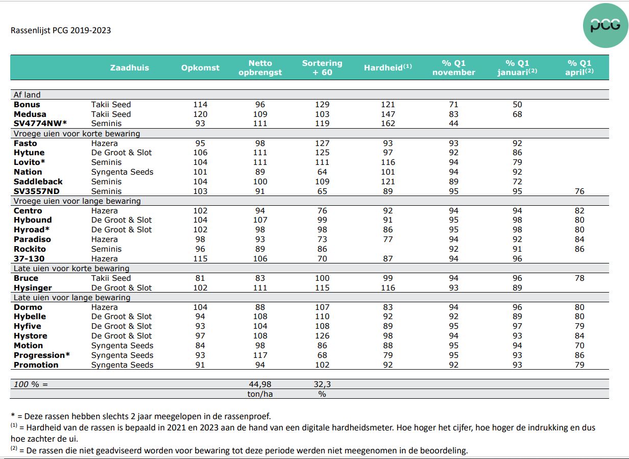 De Nederlandse rassenlijst, samengesteld door het UIKC, is intussen welbekend in de sector. Tot op heden werd deze lijst ook met regelmaat geraadpleegd door Vlaamse telers en adviseurs. Op deze lijst staan echter enkel bewaarrassen, geschikt voor de Nederlandse markt. PCG stelde, op basis van de verzamelde gegevens van de afgelopen jaren, zelf een rassenlijst samen die meer geschikt is voor Vlaanderen. Hierin zijn ook rassen meegenomen die geschikt zijn voor afzet af land, korte of middellange bewaring. Er zijn zowel rassen voor de industrie als voor de versmarkt opgenomen.