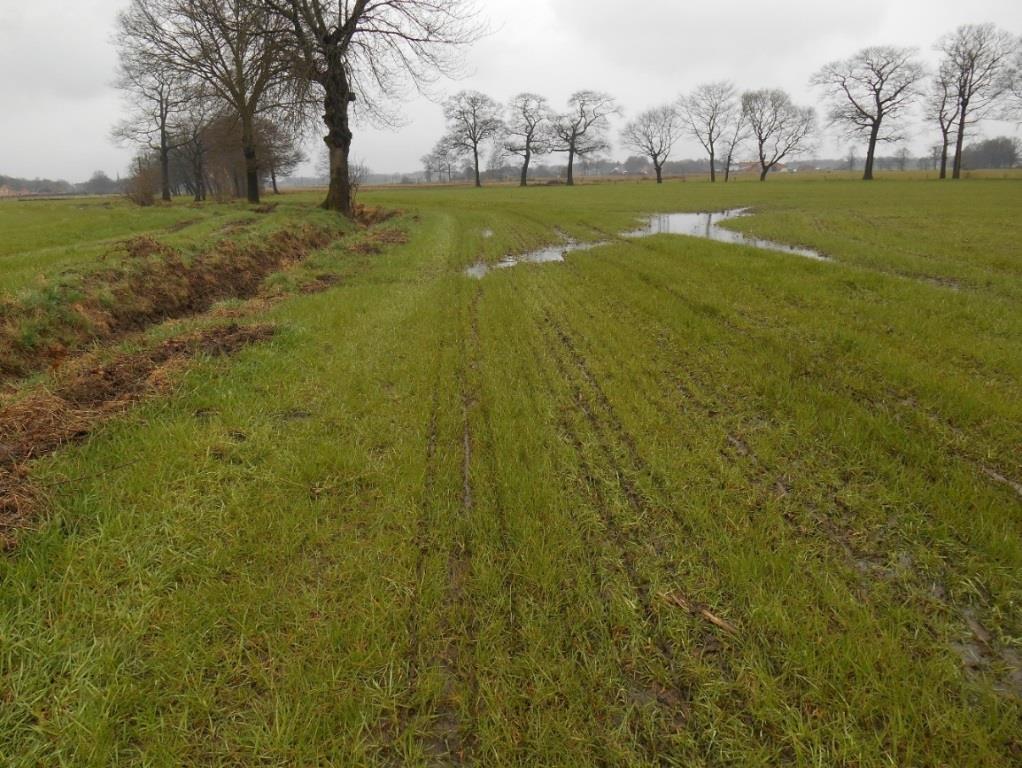 Foto 3: Combinatie van onvoldoende afstand van waterloop + ‘winter’ afwateringsgeulen niet dichtgemaakt alvorens te bemesten.