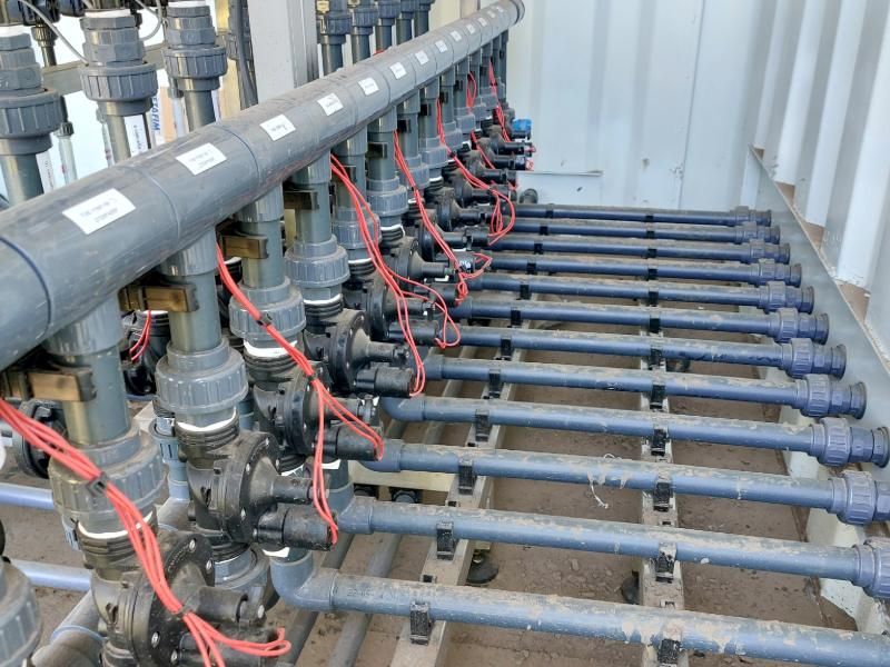 De fertigatie-unit is uitgerust met 14 kraanvakken. Voor de injectie van meststoffen zijn er 11 venturi-systemen.  De watertoevoer komt via een wachtcontainer op het perceel.