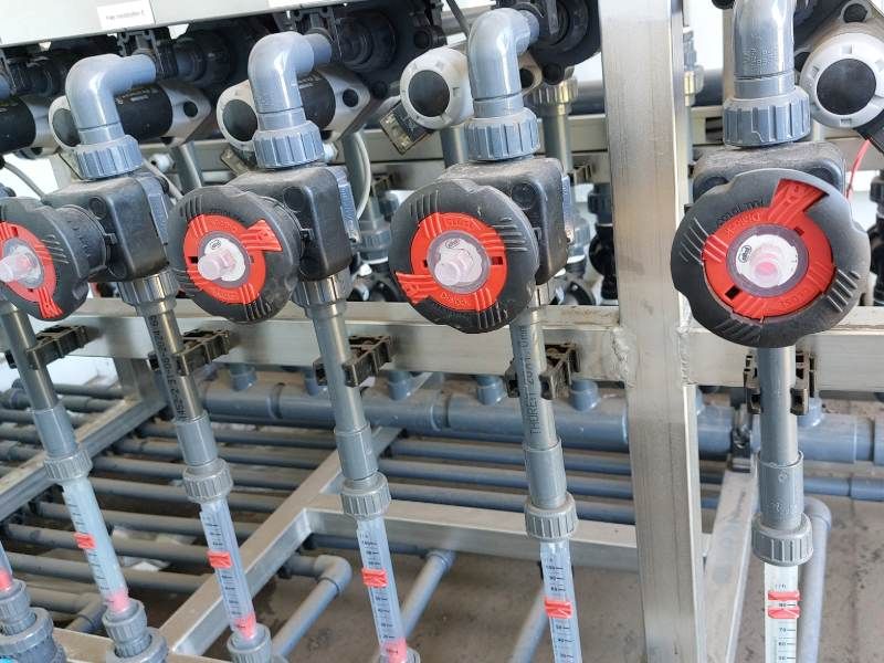 De fertigatie wordt uitgevoerd met een fertigatie-unit van Viaverda, uitgerust met 14 kraanvakken en 11 afzonderlijke venturi-systemen voor meststofinjectie. Deze unit bedient niet alleen de uienproef, maar ook parallel lopende proeven in aardappel en prei. Alles wordt aangestuurd vanuit een 10 ft-container die onder meer is uitgerust met een drukregelaar, manometer, flowmeter en EC-meter. De watertoevoer komt via een wachtcontainer op het perceel.