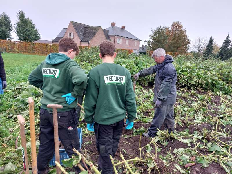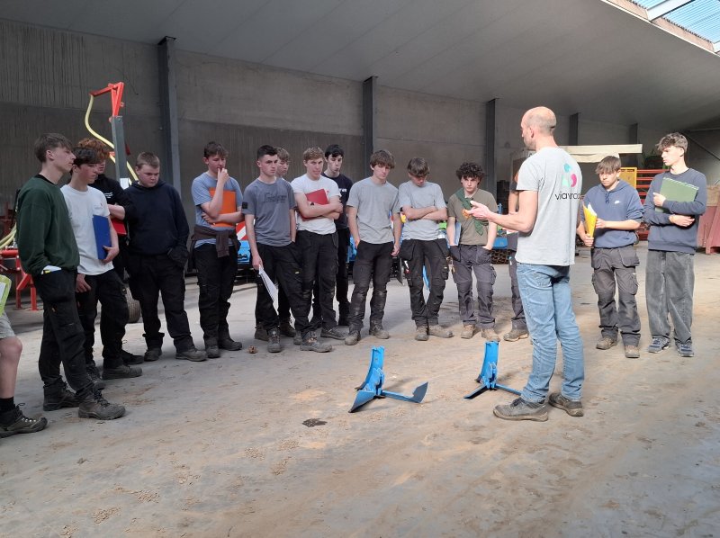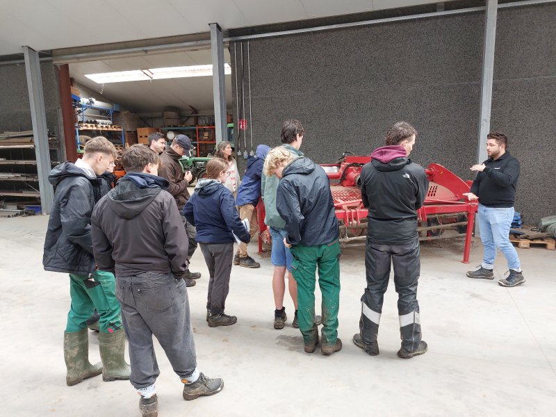 De leermomenten verliepen heel praktisch. Viaverda-medewerker Jonas Bodyn geeft uitleg over de machines. Leerlingen konden ook oogsten op onze proefvelden.