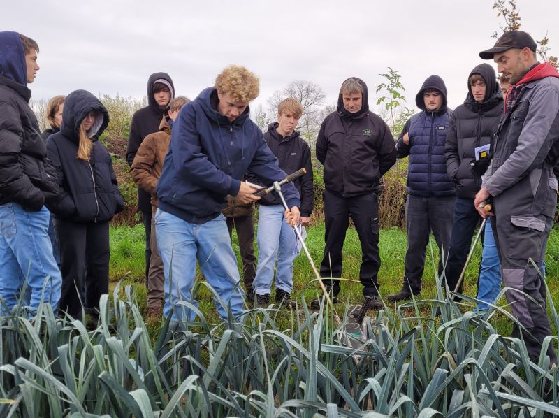 Via stalmest wordt gemiddeld drie keer meer koolstof aangebracht dan met drijfmest. Naast dierlijke mest kunnen ook andere organische bemestingsvormen, zoals compost, op het veld worden toegepast om het koolstofgehalte te verhogen. Tijdens de praktijksessie op het proefcentrum in Kruisem werden de leerlingen het veld ingestuurd met het B3W-boekje ‘Zelf je bodem testen: eerste hulp bij bodembeheer’. Met deze gids kunnen ook telers aan de slag om zelf de bodemkwaliteit op hun perceel te onderzoeken. Deze biedt inzicht in de verschillende aspecten die de kwaliteit van je bodem en zo ook je teelt beïnvloeden: komt de doorworteling in het gedrang door een verdichte laag? Welke structuur is een goede structuur? Wat zegt het aantal wormen in een aardkluit over mijn perceel?