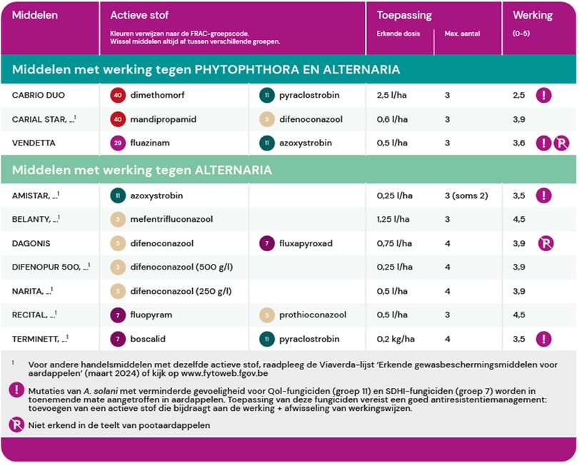 Bij de keuze van fungiciden moet daar dus terdege rekening mee gehouden worden. Onoordeelkundig gebruik van middelen kan immers leiden tot een snelle selectie van deze resistente variant van de ziekte. Resistentie treedt op tegen de actieve stoffen mandipropamid (o.a. Revus), dimethomorf (die we vroeger kenden in Acrobat, nu o.a. Orvego Star, Presidium e.a.) en benthiavalicarb (bv. Versilus).
