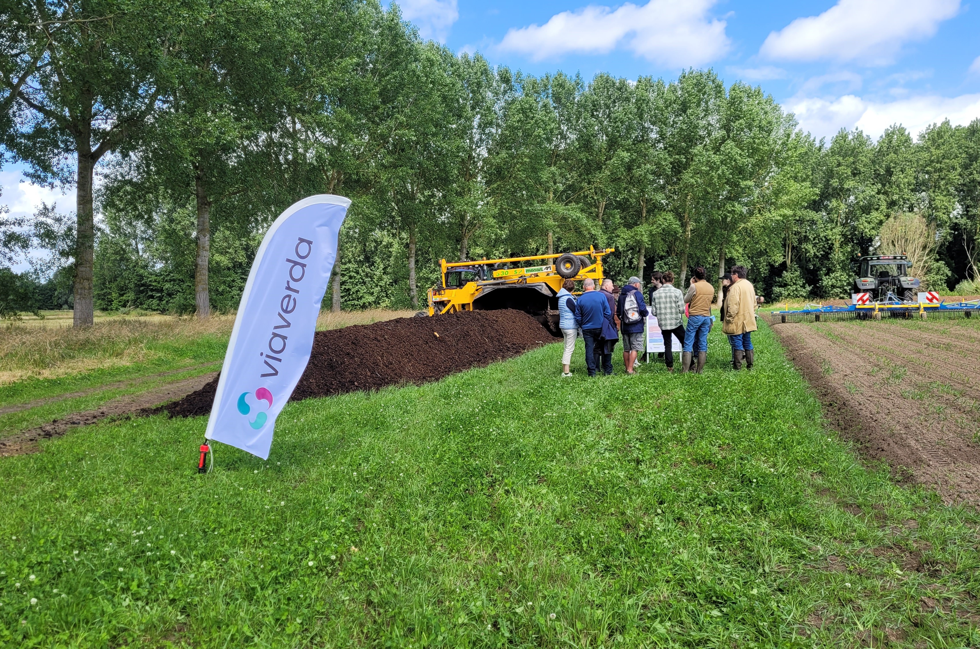 Tijdens de demodag stonden onderzoekers van Viaverda de aanwezigen te woord over boerderijcompostering. We lichtten het composteringsproces toe, met de voordelen en uitdagingen die het stelt en gaven praktische tips en concrete voorbeelden van hoe telers dit kunnen aanpakken op het eigen bedrijf. Je vond ons naast de compostrils die op het platform waren aangelegd. In samenwerking met het ILVO ondersteunden we bij de opbouw en het keren van de compostrils. Onze compostkeerder was ook ter plaatse om het keren van een composthoop te demonstreren.