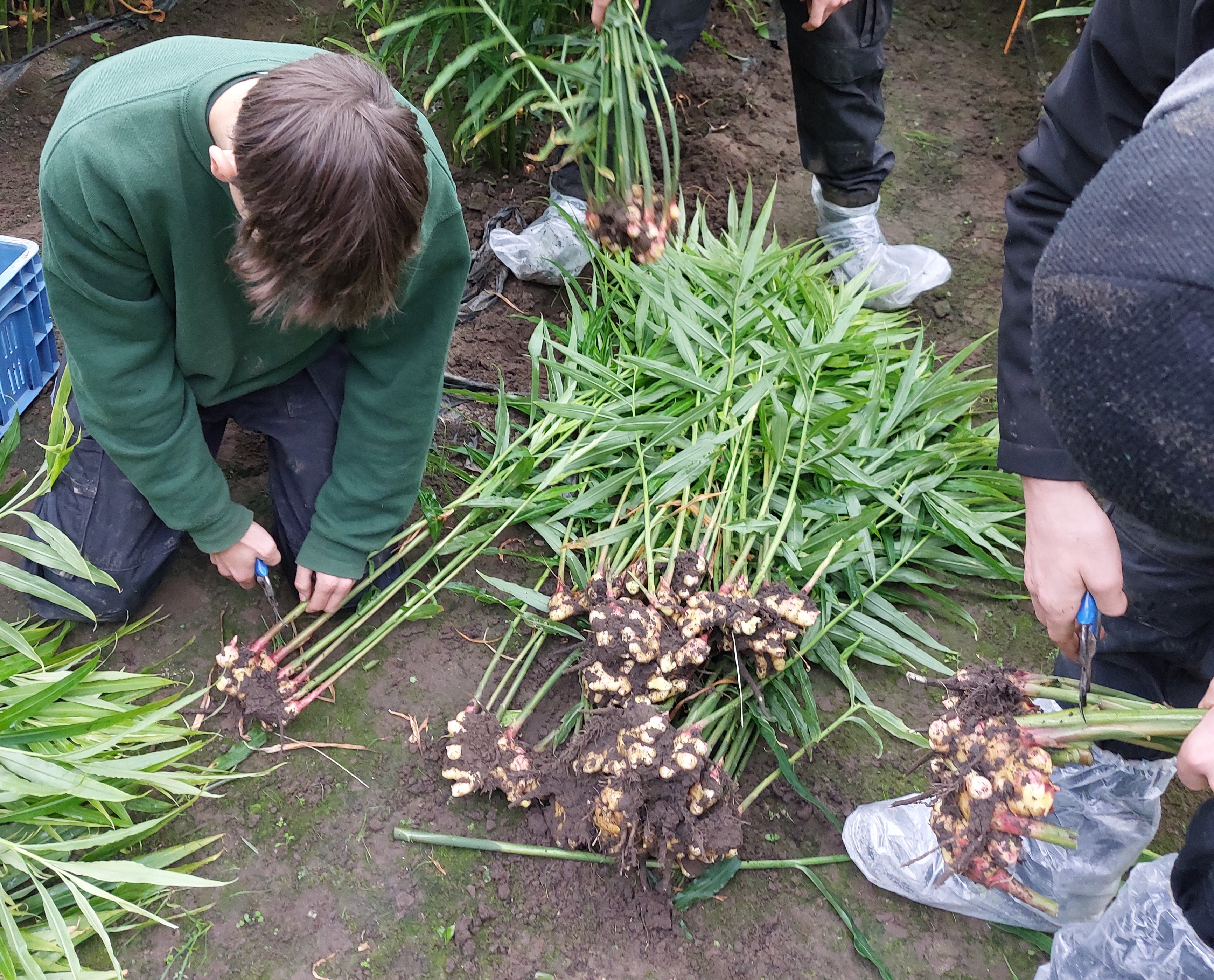 | Foto: Leerlingen mochten gember rhizomen oogsten. |