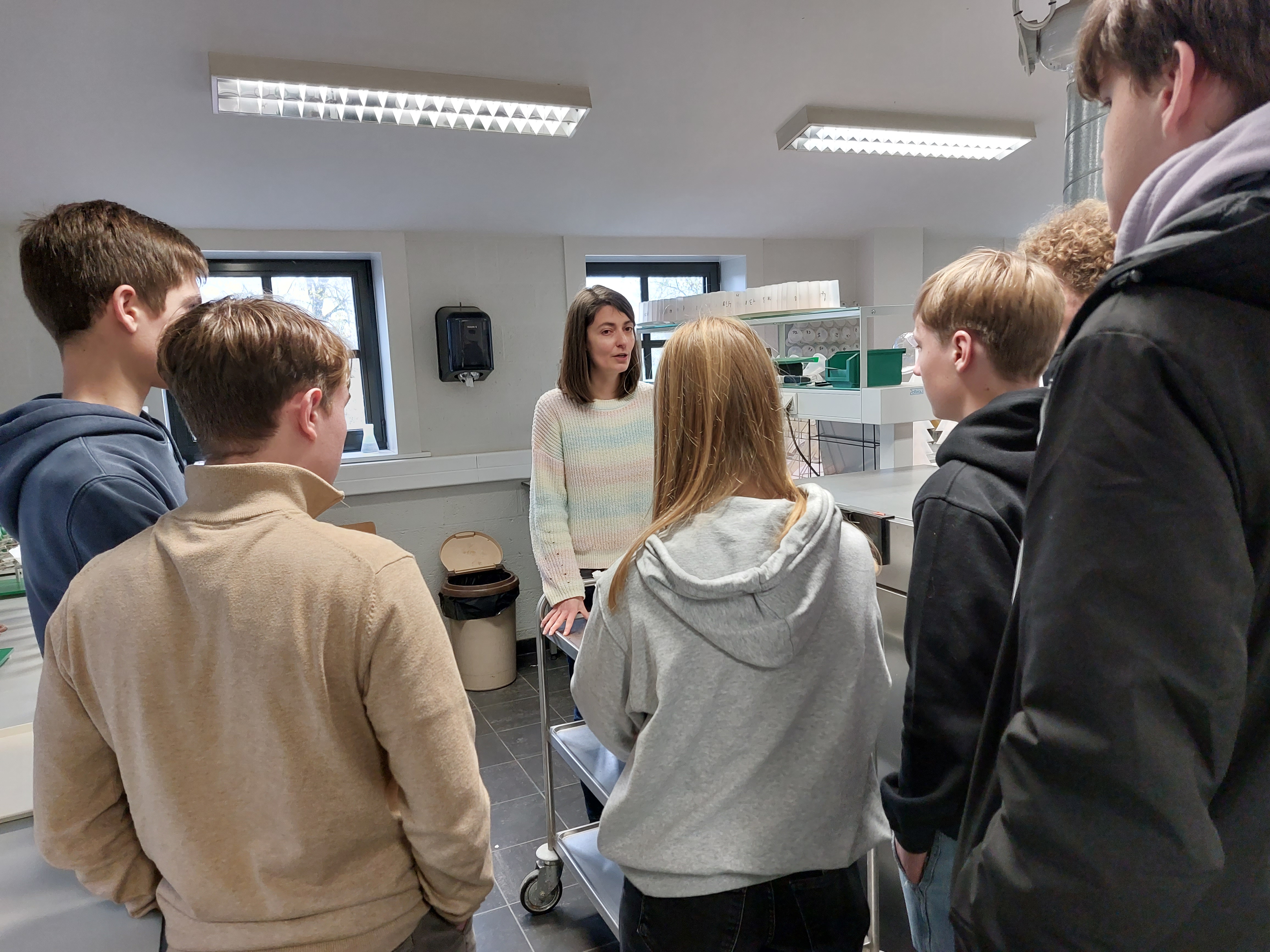 Bij het praktische luik van het thema 'Duurzaam Bodembeheer', startte het voor de leerlingen van Bernardustechnicum Oudenaarde met een rondleiding in het laboratorium voor bodemanalyses door de bedrijfsleider Jana Van Steenkiste. Vervolgens liet onderzoeker Lien De Schrijver, de leerlingen en leerkracht de bodem en de bodemkwaliteit op het veld waarnemen. Zo mochten de leerlingen bodemverdichting waarnemen door met een prikstok storende verharde lagen op te sporen. Een andere methode om bodemkwaliteit te bestuderen, is een profielput graven. In de profielput kan de bodemstructuur, bodemkleur, beworteling en bodemleven worden beoordeeld. De gecompacteerde lagen die ze met de prikstok waarnamen, zagen ze ook terugkomen in de put.