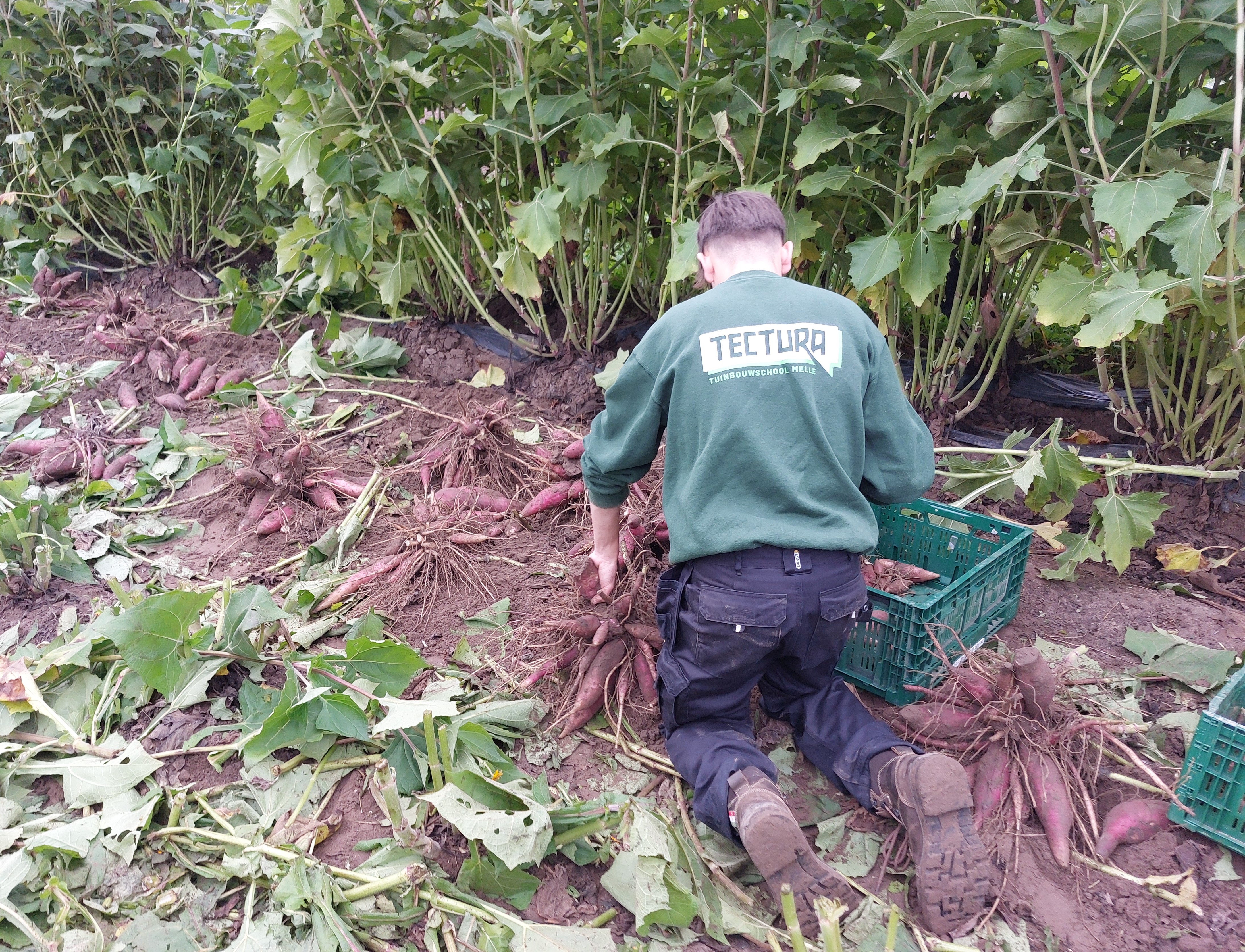 Binnen het thema 'Potentieel van Nieuwe Teelten', werkten de leerlingen van Tectura Melle samen met de proefveldmedewerkers van Viaverda. Ze hielpen de gember te oogsten, en de geoogste planten te beoordelen door rhizomen te wegen en stengels te tellen. Door de handen uit de mouwen te steken, leerden ze de oogsttechniek van gember en de meeste praktische vaardigheden die nodig zijn voor een succesvolle gemberteelt. Ook bij de teelt van yacon hebben ze twee verschillende rassen geoogst. De leerlingen konden zo hands-on ervaren hoe deze teelt toch heel wat manuele arbeid vergt om de knollen uit de grond te tillen en de eetknollen van de plant af te breken.