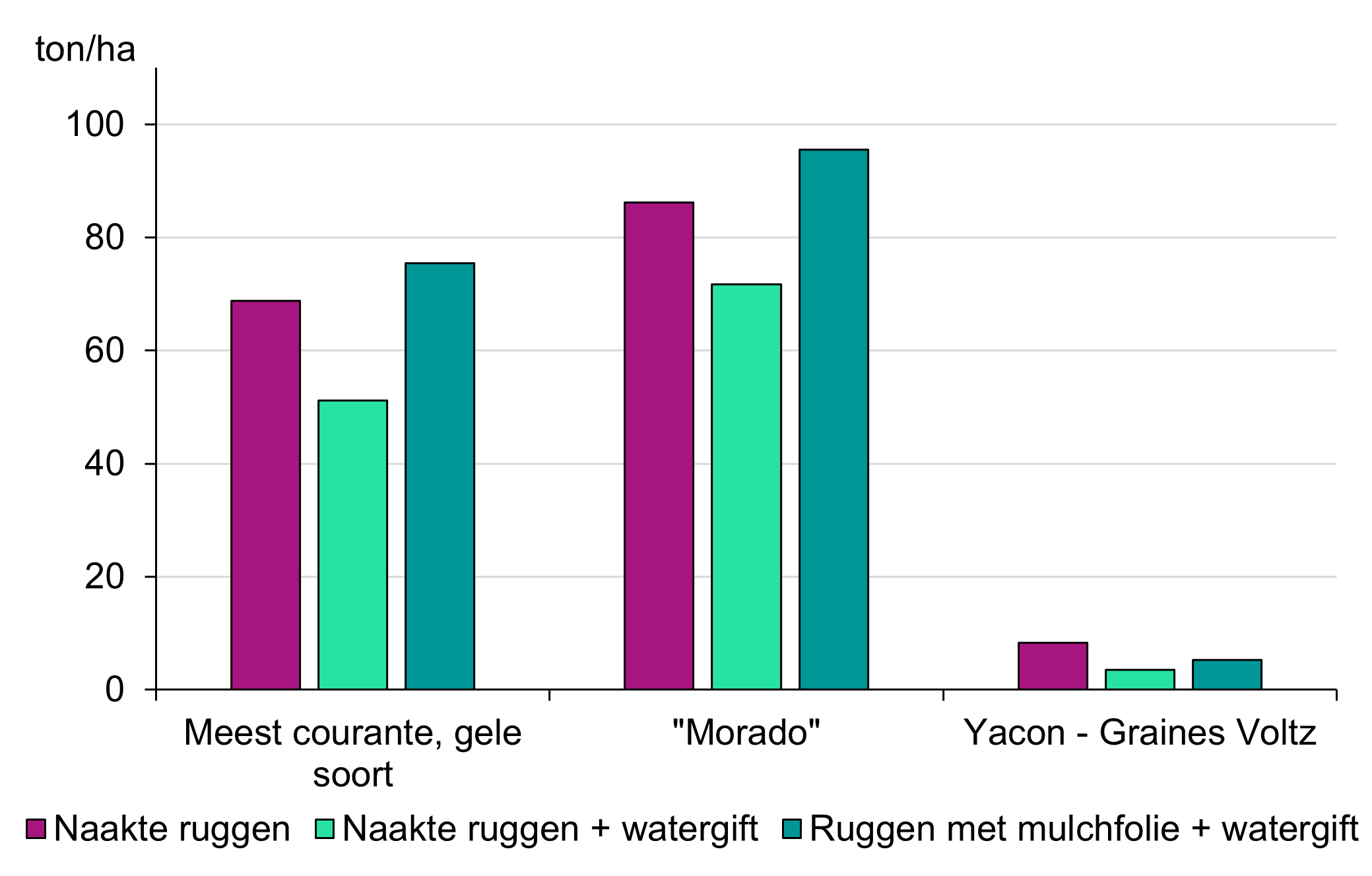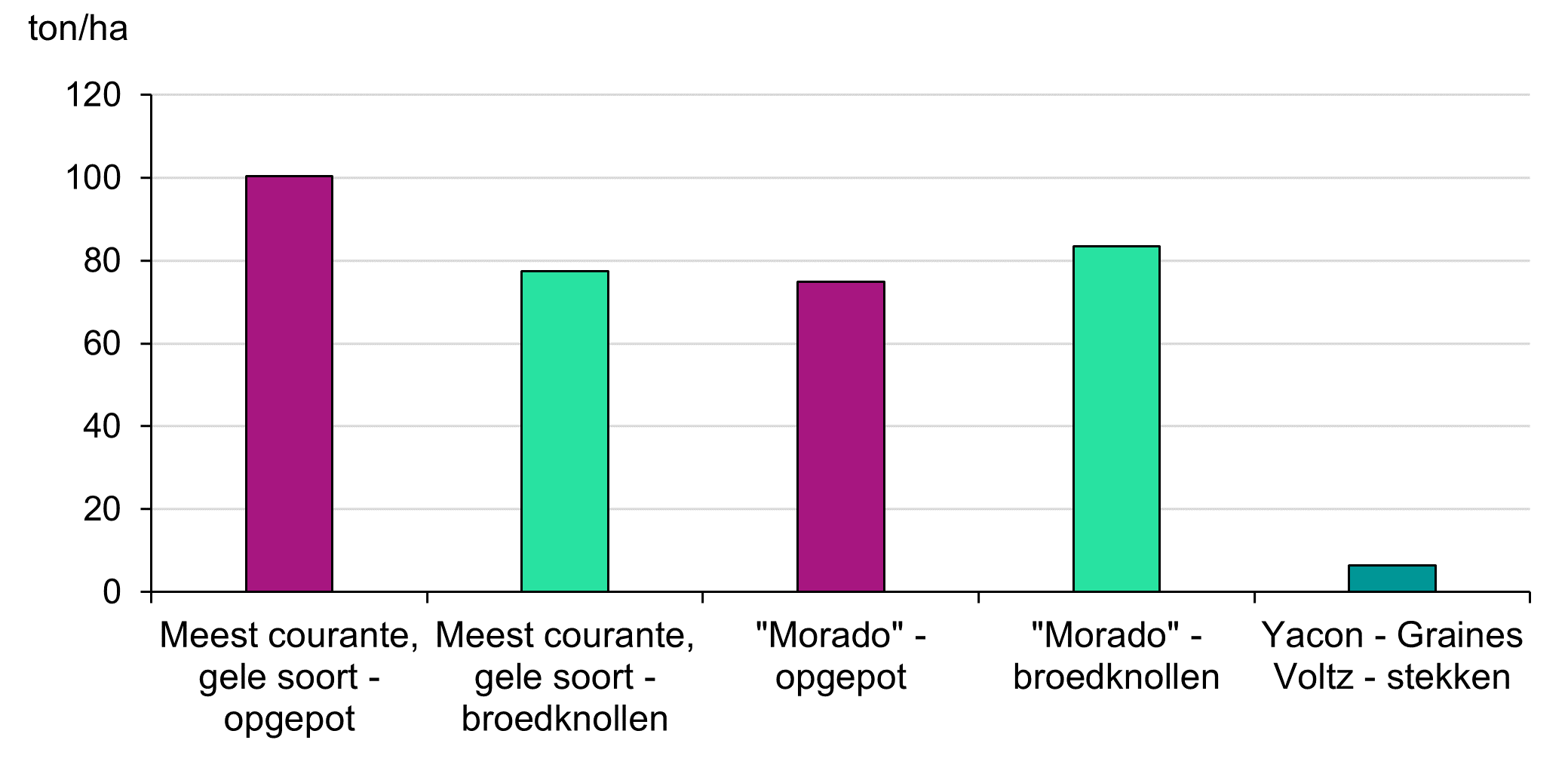 Bij oogst op 6 en 7 december stelden we vast dat de yacon stekken van Graines Voltz een erg beperkte opbrengst aan eetknollen opleverden. Wat de reden is voor die beperkte ondergrondse ontwikkeling is niet gekend. Het effect van de teeltsystemen kon bij dit ras dan ook niet geëvalueerd worden. Bij de 'Meest courante, gele soort' en Morado zien we telkens een duidelijke meerwaarde van het gebruik van mulchfolie op de bruto opbrengst (er werd geen verkoopbare opbrengst bepaald). De invloed van watergift kon door de overvloedige neerslag dit seizoen niet geëvalueerd worden. Algemeen zien we dat Morado dit seizoen erg goed presteerde. Over de verschillende teeltsystemen heen lag de bruto opbrengst van Morado telkens 18 à 20 ton/ha hoger dan de bruto opbrengst van de 'Meest courante, gele soort'.